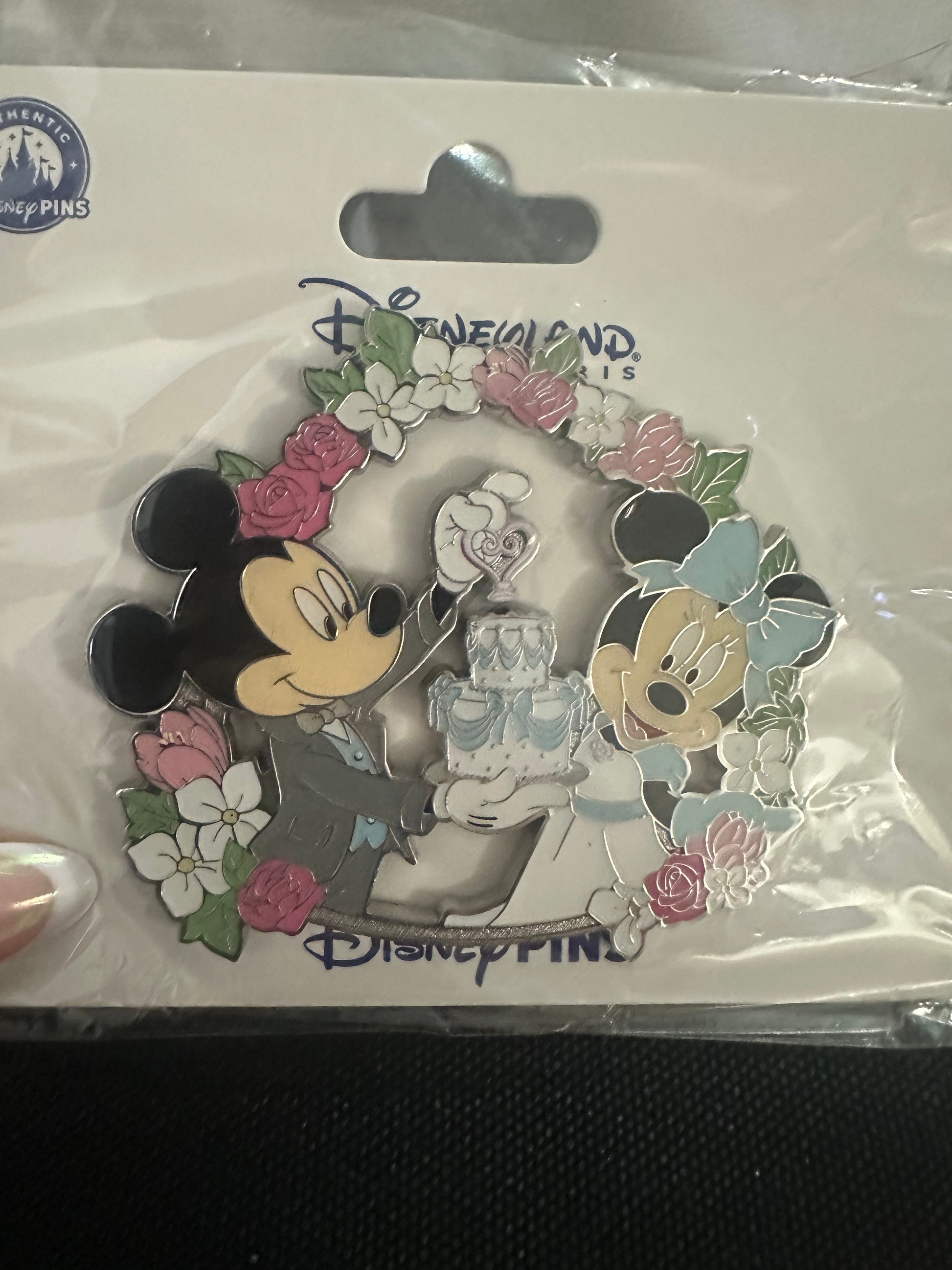 This romantic Disneyland Paris pin features Mickey and Minnie Mouse dressed in wedding attire, sharing a special moment over a beautifully detailed cake. Surrounded by a pastel floral wreath with roses and blossoms, the design captures the joy of love and celebration. A perfect collectible for Disney couples fans, wedding-themed collections, and Mickey & Minnie lovers alike.