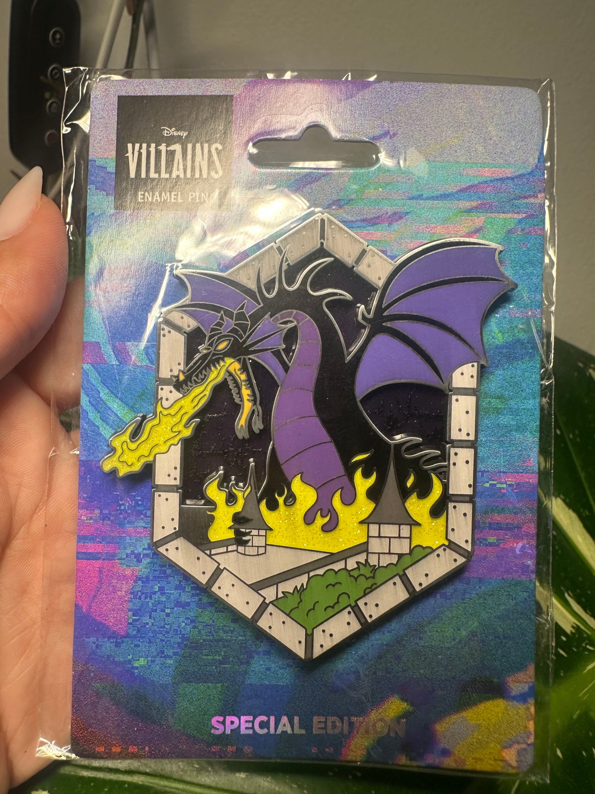 Unleash the power of Disney’s most iconic villain with this Special Edition Maleficent Dragon enamel pin. Featuring Maleficent in her fierce dragon form, breathing fire over a castle backdrop, this bold design is perfect for Disney Villains collectors and fans of Sleeping Beauty. With vibrant colors and striking details, it’s a must-have piece to add some villainous magic to your collection.